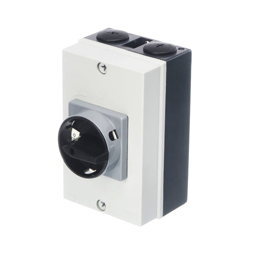 Polycarbonate plastic with plastic screws securing cover to base, IP65 rated for indoor or outdoor installation.