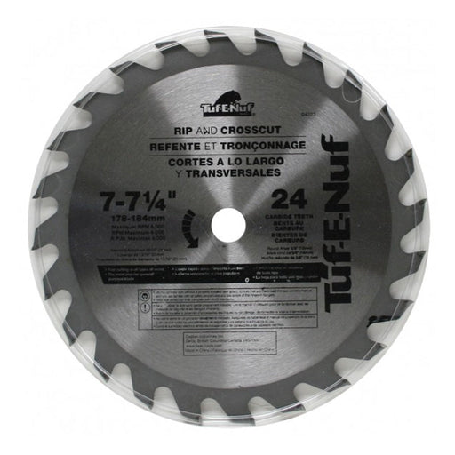 Tuf-E-Nuf Framing and Decking Saw Blade, 7-1/4 in Diameter, Carbide Cutting Edge, ATB Teeth, 5/8 in Arbor, 20 deg Hook Angle, 0.087 in Kerf, Applic...